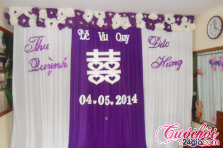 Phông cưới lễ vu quy được trang trí theo tông màu tím, phông cưới hoa giấy nhẹ nhàng được cô dâu chọn cho ngày vu quy của mình